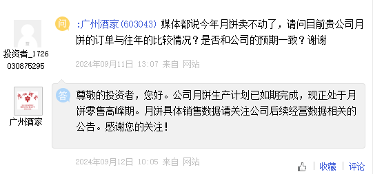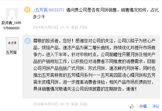 另一月饼生产企业——五芳斋(603237)近期也就投资者提出的月饼销售问题进行了回应,但并没有直接回应销售情况。
