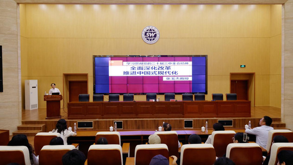 张玉杰着眼于全局思维,通过理论和案例相结合的方式展示了世界经济的总体态势,分析了以“一带一路”建设为代表的中国国际化战略布局。他指出,党的二十届三中全会全面谋划了进一步全面深化改革、推进中国式现代化的新蓝图,并鼓励师生立足山外大,放眼全世界,利用当前国家的战略机遇期,踔厉奋发,施展抱负,在实现自我价值的同时推进中华民族伟大复兴。