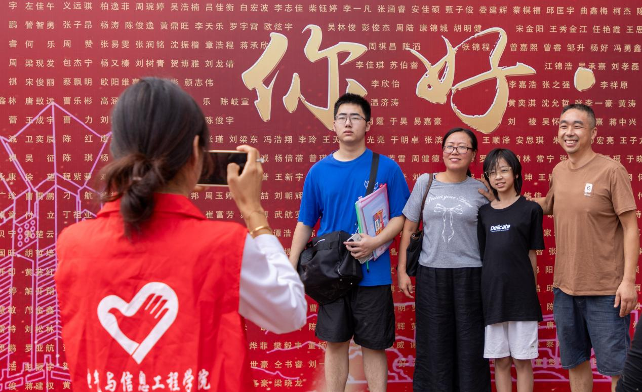 新生在学院精心布置的报到点打卡。 (陈江楠 摄)