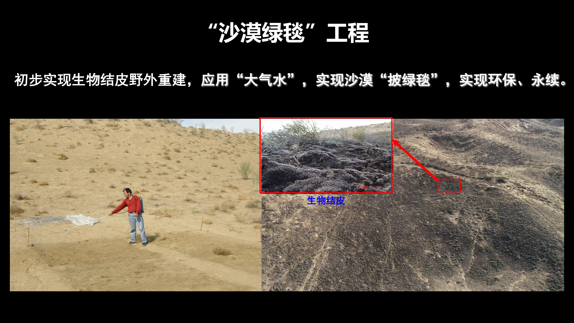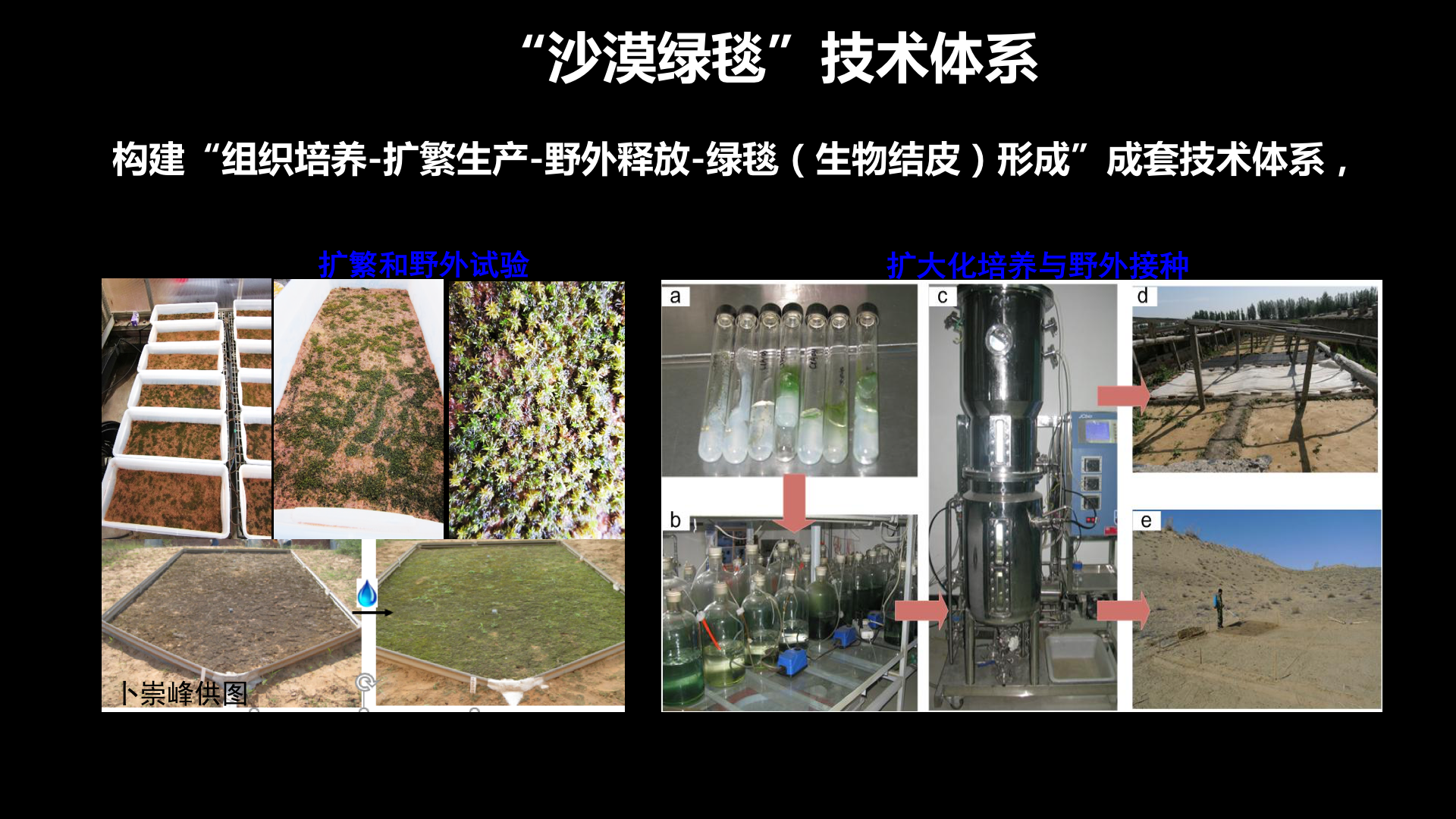 那么包括我们研究所在内的团队,和国内的很多团队也都在做这样的一个尝试,已经成功地构建了一系列的技术体系,包括苔藓怎么去撒、跟哪种藻去施加配置最好最优、跟哪种细菌去混合最优等等,在一些沙漠进行了一个释放,效果现在还是比较好的。
