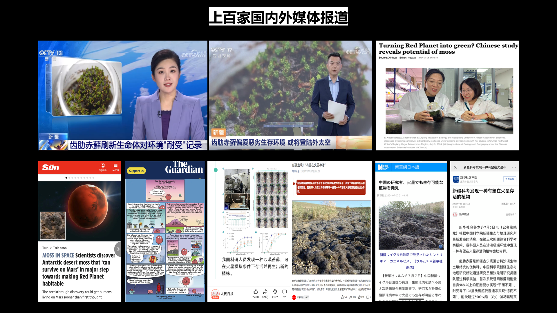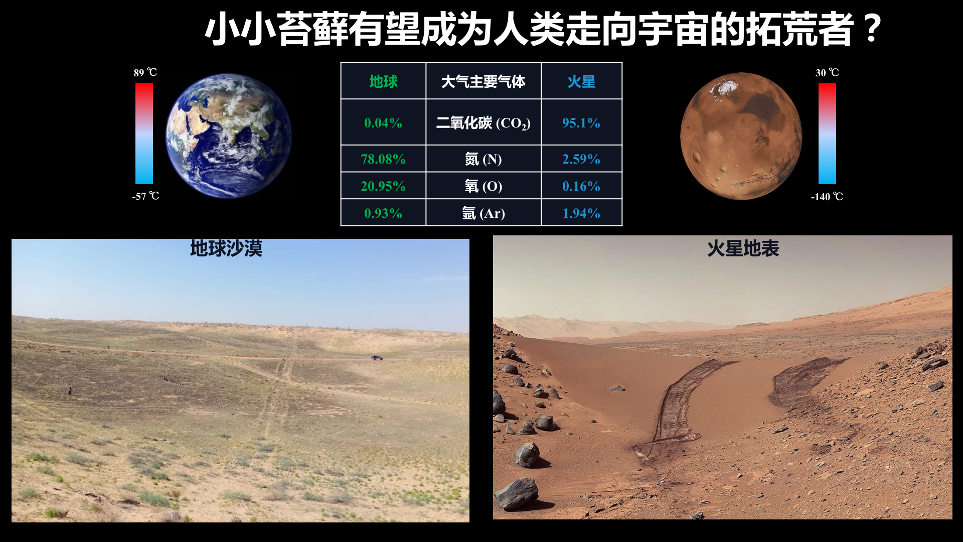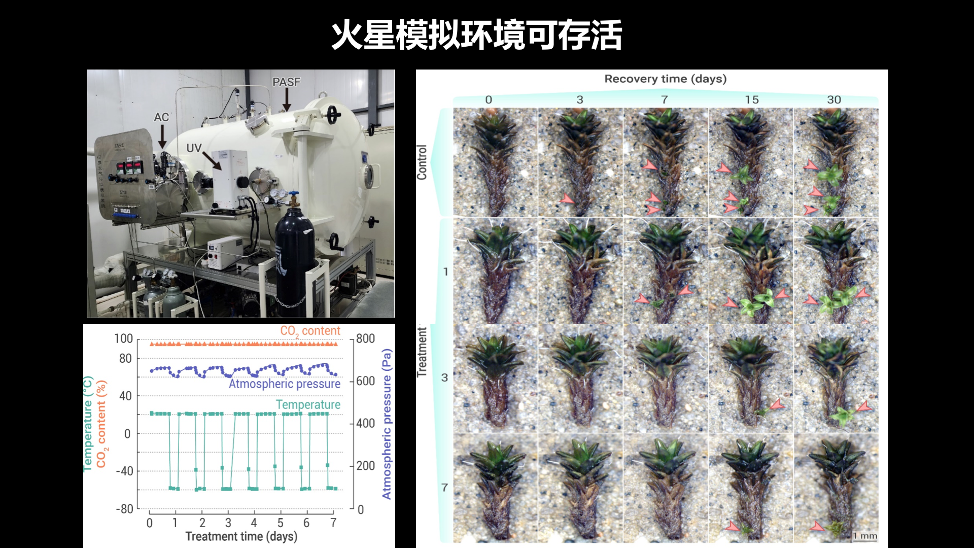 所以这个工作也是最近7月份在我们的国际期刊《创新》上,以封面进行了发表。我们认为这样一个干而不死、冻而不死、照而不死、火星模拟条件而不死的一个苔藓植物,它是一个外太空拓植,尤其是火星拓植的理想先锋,同时它除了能够拓植,它还能释放氧气,还能固定二氧化碳,它还能去改良土壤,应该是一个非常好的拓荒者。