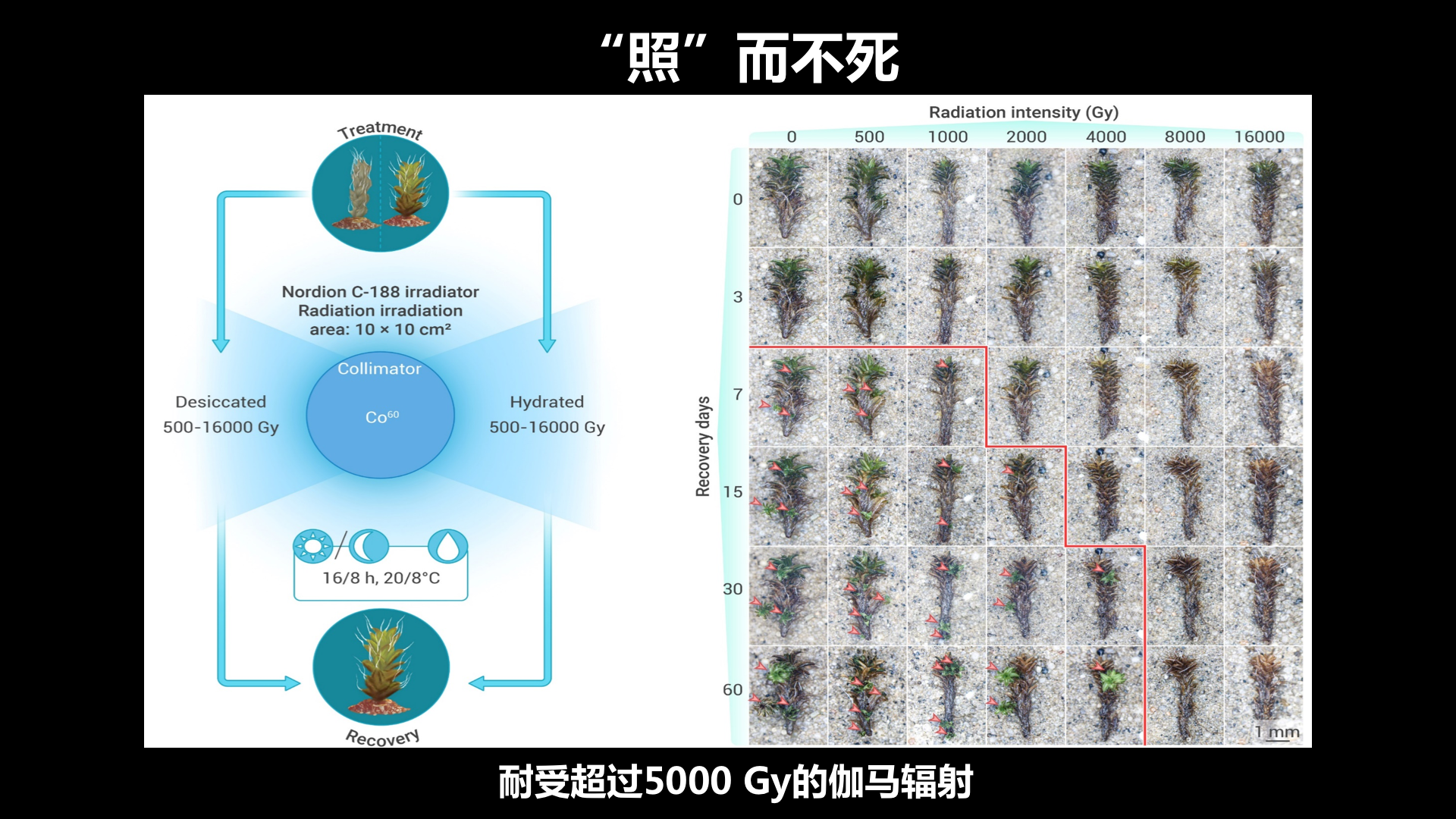 我们证明了它能耐受至少超过5000Gy的伽马辐射,这是什么概念呢?我们人 只能耐受10+Gy就会死亡。