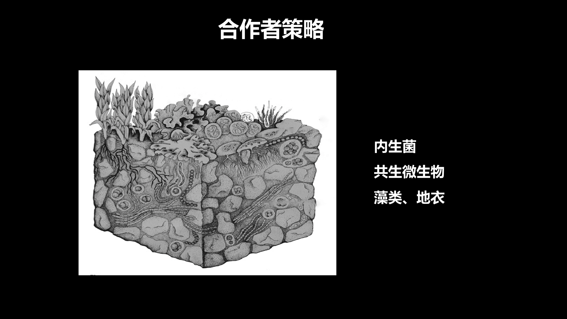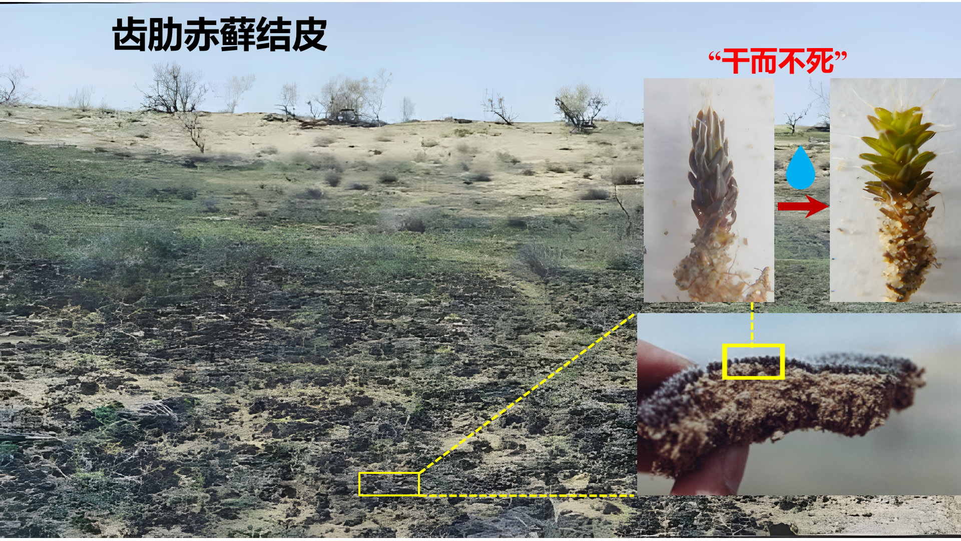 刚刚讲到,大家看它原生境是一块结皮,就是由苔藓,齿肋赤藓组成的主要成分,但是里面其实还有一些微生物,尤其是根际微生物,还有一些看不清楚的藻类等等,这些抗逆性也非常的强,它们在一起共生,形成一个复合体,然后来抵抗环境的极端逆境。所以它是一个非常“会”会的合作者,它学会了强强联合,美美与共。