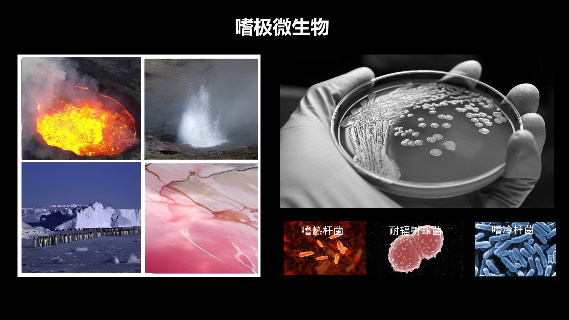 除了水熊虫以外,我们的很多火山、冰川、盐湖等等,有非常多的嗜极微生物,它们具有非常强的一个抗逆能力,抗辐射、抗酸碱、抗热等等。