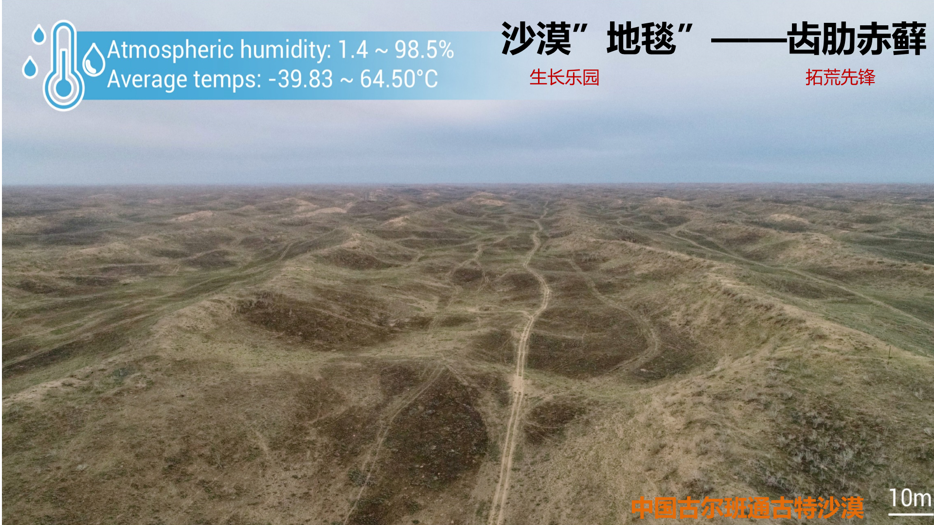 大家看沙漠腹地里面黑色的部分,其实就是我们齿肋赤藓组成的一个群体。因为有它作为先锋植物,先固定在裸沙的表面,起到了保水固沙,调节碳氮循环等重要的生态功能,其他的植物,包括梭梭等都会慢慢地来融入这个家园,它们一起协作,才让古尔班通古特沙漠不像塔克拉玛干一样荒凉。