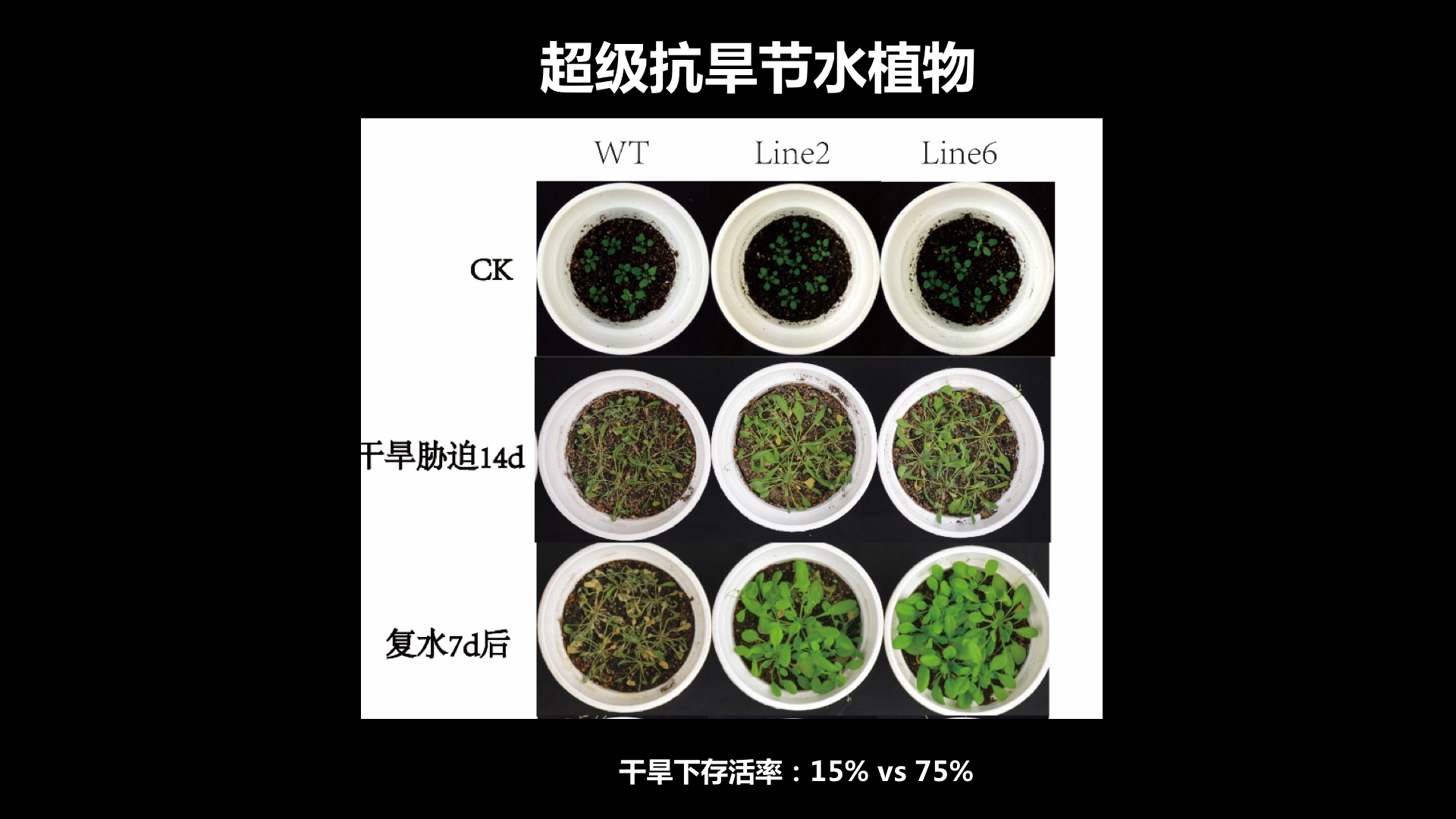 比如说我们把一个DREB基因,苔藓有的这个基因,干而不死的一个关键基因,转到了模式植物拟南芥里面,我们发现确实可以让拟南芥起死复生。如果不加这个基因进去,拟南芥80%会死亡,不能复苏。