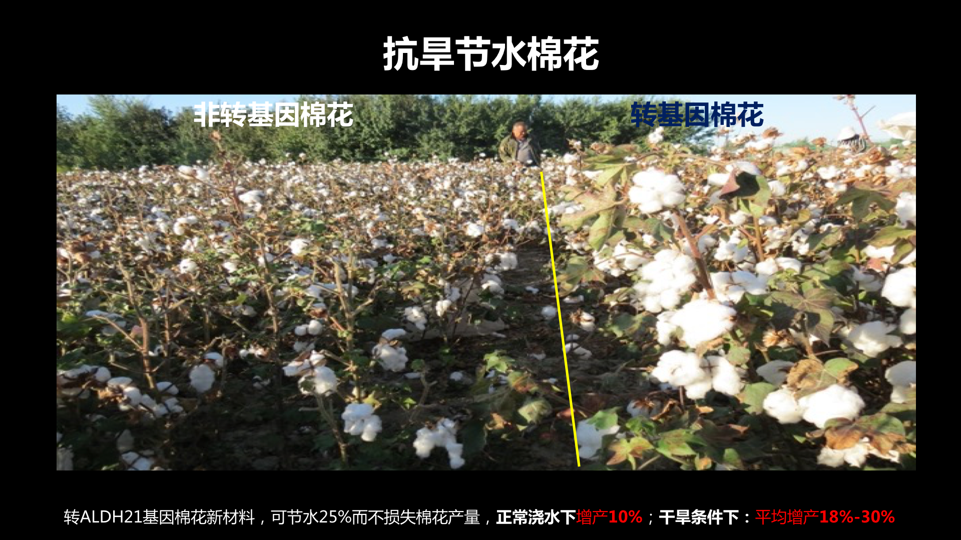 我们惊喜地发现,确实它在正常情况下能让棉花长得快,长得大,高产,当逆境 节水,就是少浇水的情况下,它依然有很高的产量,它比我们没有转化的提高了18%~30%之间;