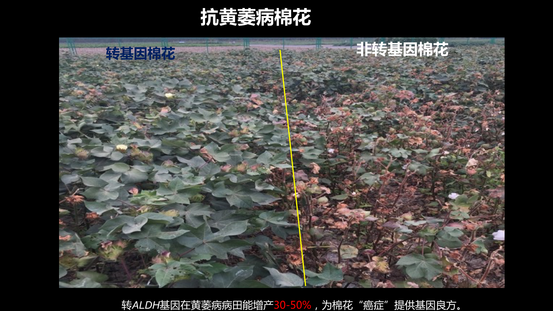 更让人惊喜的是,这个材料在大田,在黄萎病的病田里,不仅干而不死,还实现了极强的一个抗黄萎病的抗性。黄萎病来的时候棉花基本上绝收,因为它会是一个蛀干的病害,让它不能吸收水分和养分,整个是绝收和没有产量的。那么转了我们的基因,至少能收30%的棉花产量。