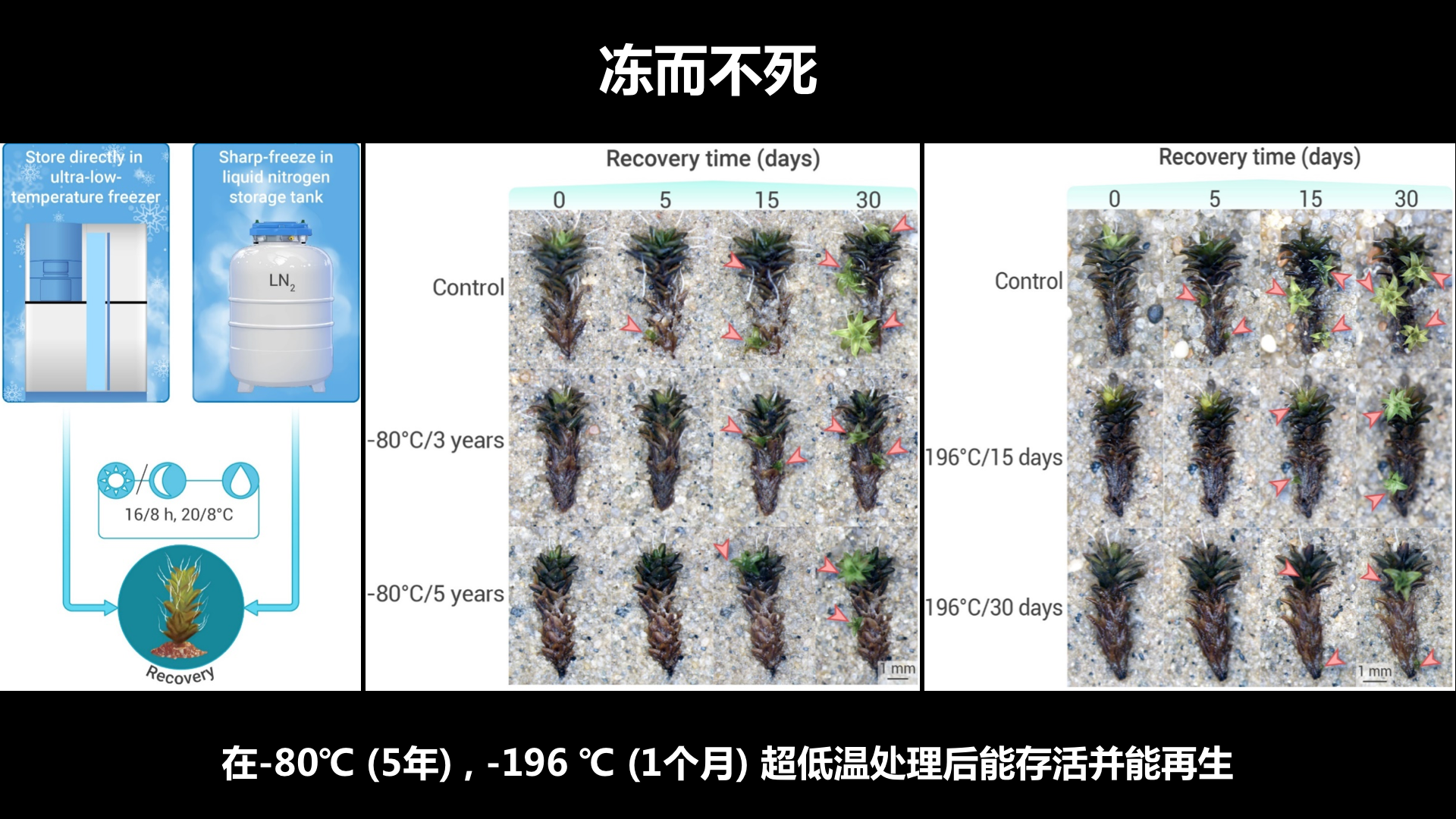 然后我们上了一个更狠的,我们咬着牙,试一下液氮行不行?对,-196℃低温!我们扔到液氮里面去做了六个月,拿出来也在几天之内又会长出一个新的芽点,长出一个新的植株出来。