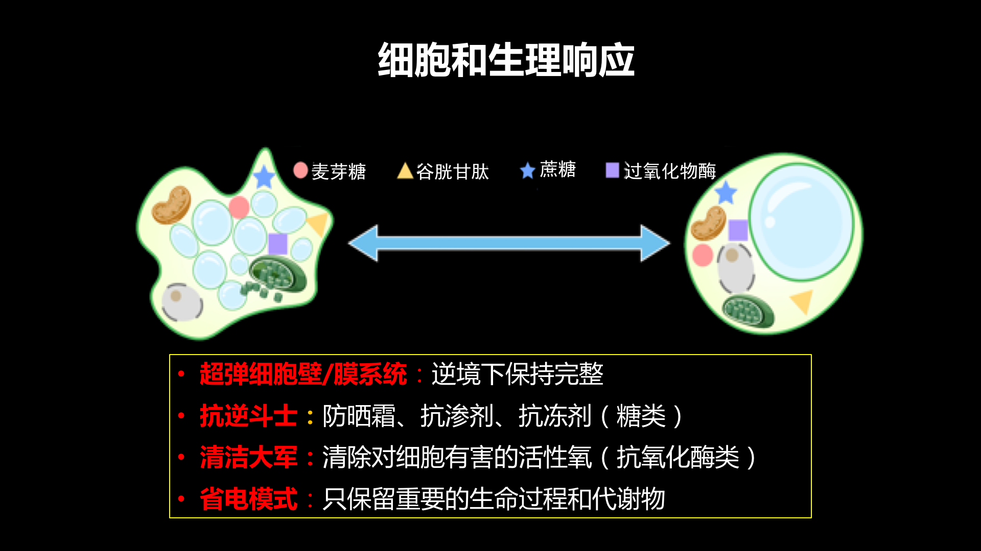 一般的逆境来了我怎么抗,严重点(的逆境)来了,我哪些基因去出发、去保护、去起作用,甚至它还进化出了非常独特的策略,尤其在干、复水这么快的过程中,很多东西是来不及的,它学会了干什么?它学会了提前存储。