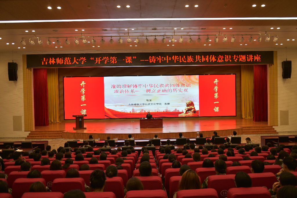 为全面贯彻铸牢中华民族共同体意识工作主线,大力弘扬“休戚与共、荣辱与共、生死与共、命运与共”的共同体理念,吉林师范大学党委抓住新学期开学的关键节点,研究部署铸牢中华民族共同体意识主题“开学第一课”系列活动,用共同的精神谱系、共同的文化认同和共同的价值观念推动铸牢中华民族共同体意识深入人心,落地校园。