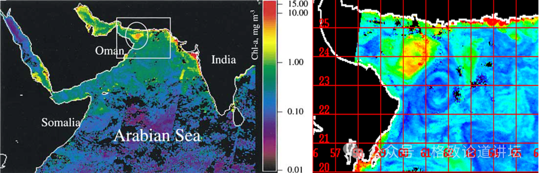 这一张图显示了阿拉伯海浮游植物的分布情况,它像是一个海洋里的大漩涡。所以我们利用卫星遥感的数据可以了解全球浮游植物的分布情况。