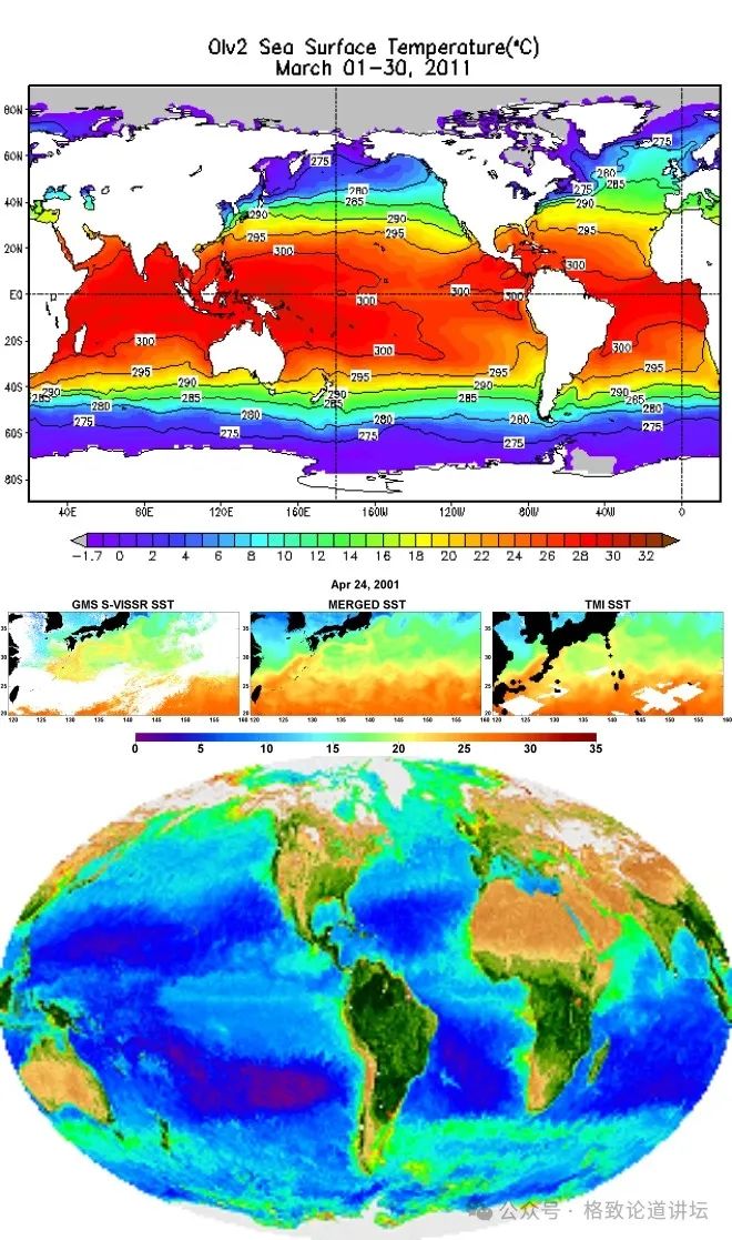 卫星除了能够看到叶绿素以外,还能看到海水温度等,比如说全球海洋温度的变化。这就是全球的温度变化情况,红色表示比较高的温度,蓝色表示比较低的温度。