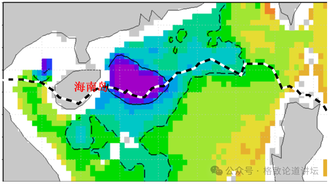 这是因为在次表层的营养盐比较多,在这里它能够接收到阳光,能够进行光合作用。所以南海台风影响是比较明显的,台风来了以后,就更容易改变温度,把下层的高营养盐水泵上来。