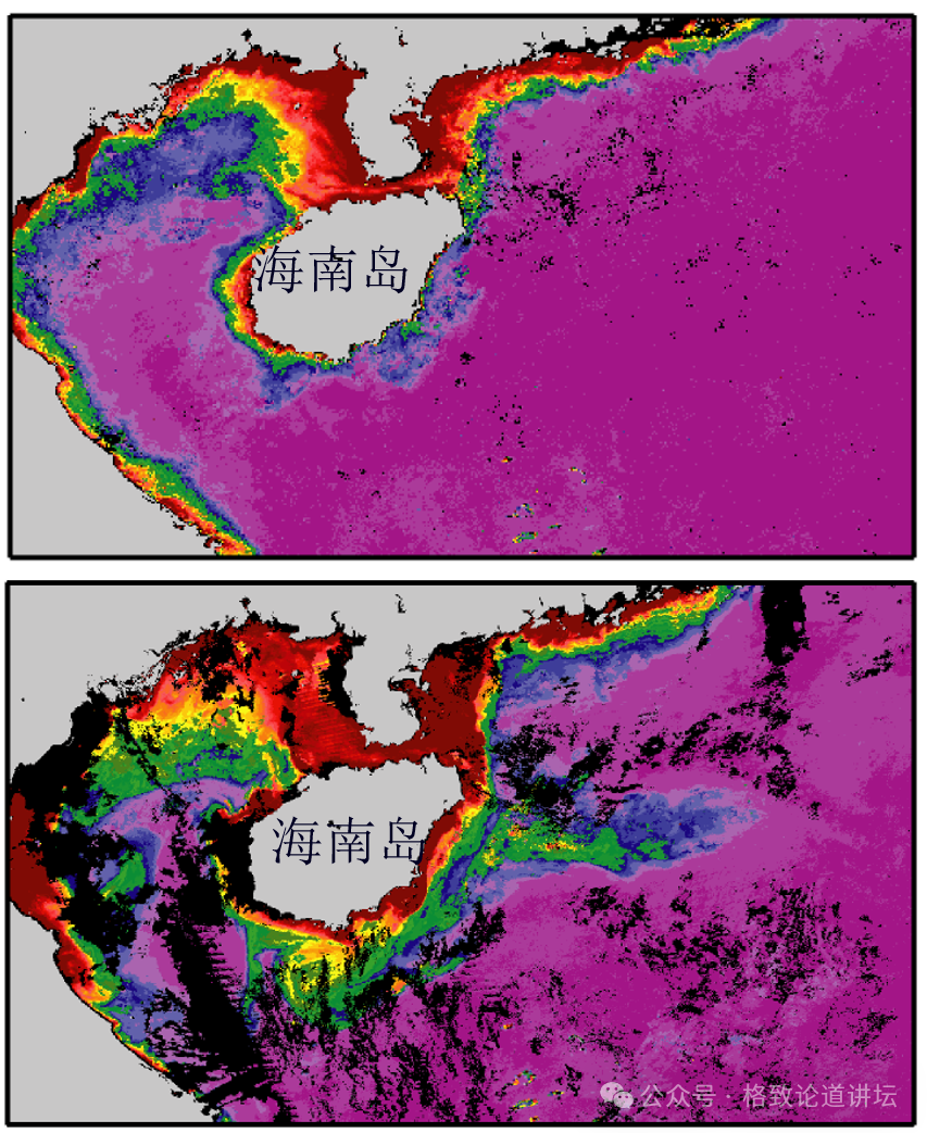 对比台风过后的卫星遥感浮游植物的分布情况,可见台风之后,海洋的海色图有很大的变化。卫星遥感数据显示在海南岛的右侧海岸,有一大片浮游植物生长。同时卫星遥感也告诉我们这片区有相应的温度的降低,大家看到紫色、蓝色表示温度降低。