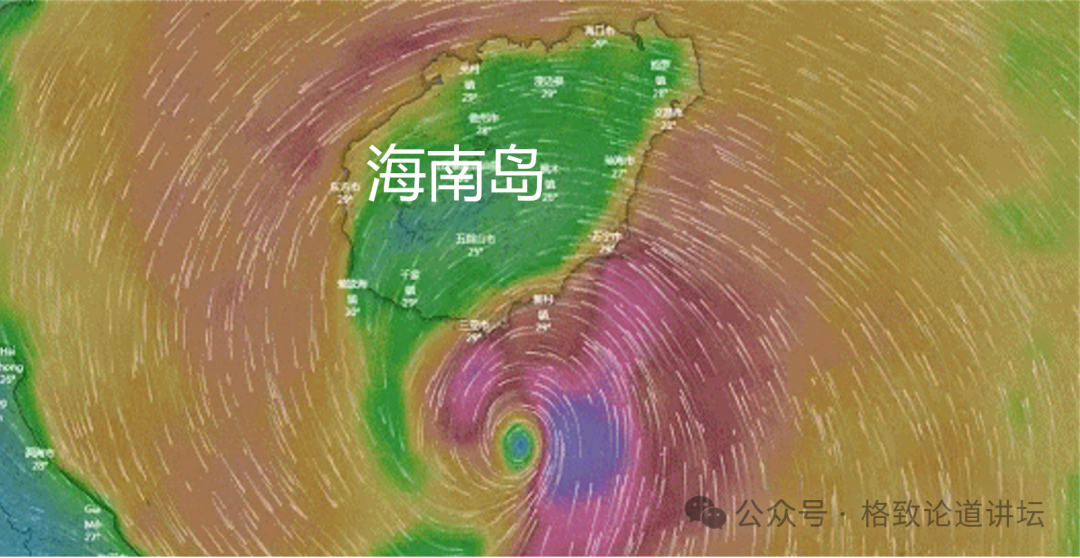 在自然界里,在海洋里面是怎样的情况呢?这个就是台风的冷迹,红色表示台风比较强,可以看到当台风到达海南岛旁边,程度非常强势。