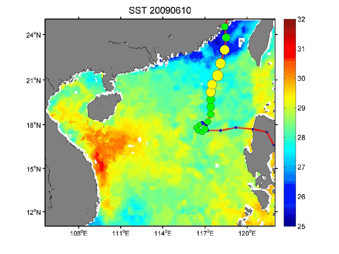 带着这个想法,我们继续做下一个研究。就像刚才我给大家举的例子,台风从东到西我们可以看到浮游植物藻华,当台风来临时,它运行的速度减慢,当在某一个地方停留的时间长不同,它所造成的影响是不一样的。