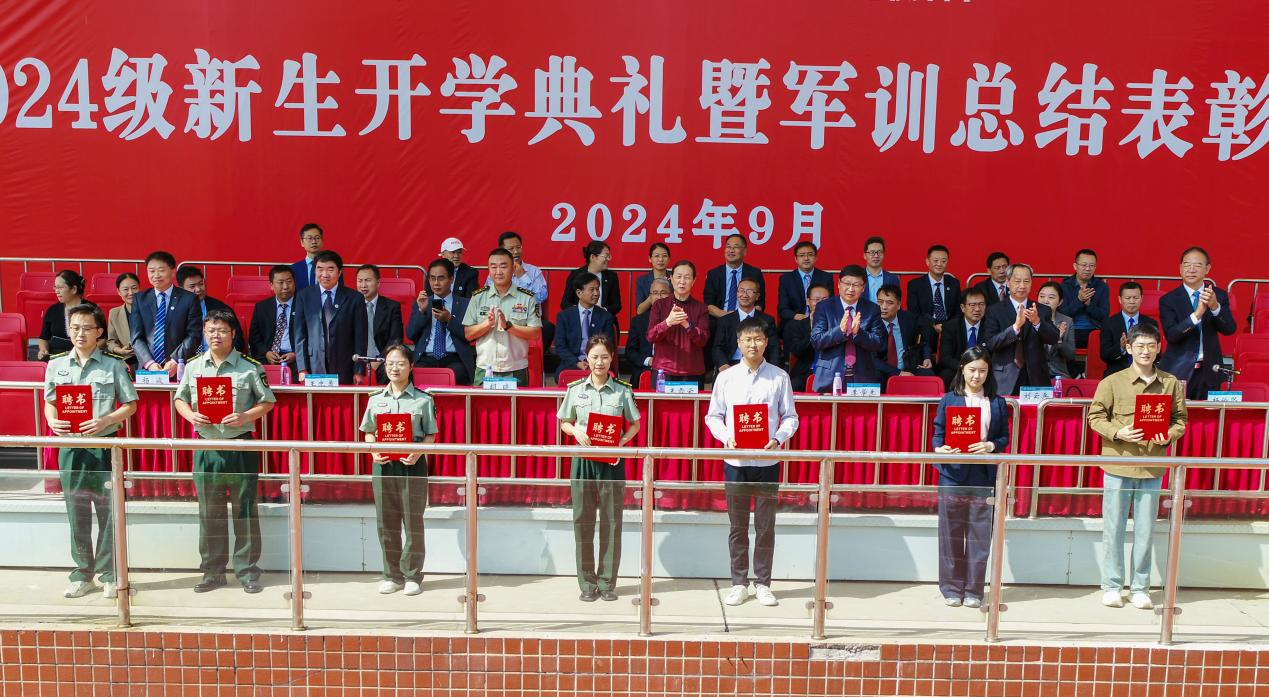 王忠勇宣读了学校关于表彰军训先进集体和先进个人的决定。校领导分别为优秀教官代表、军训优秀工作者代表、军训标兵代表等颁奖,为2024级新生辅导员代表颁发聘书。