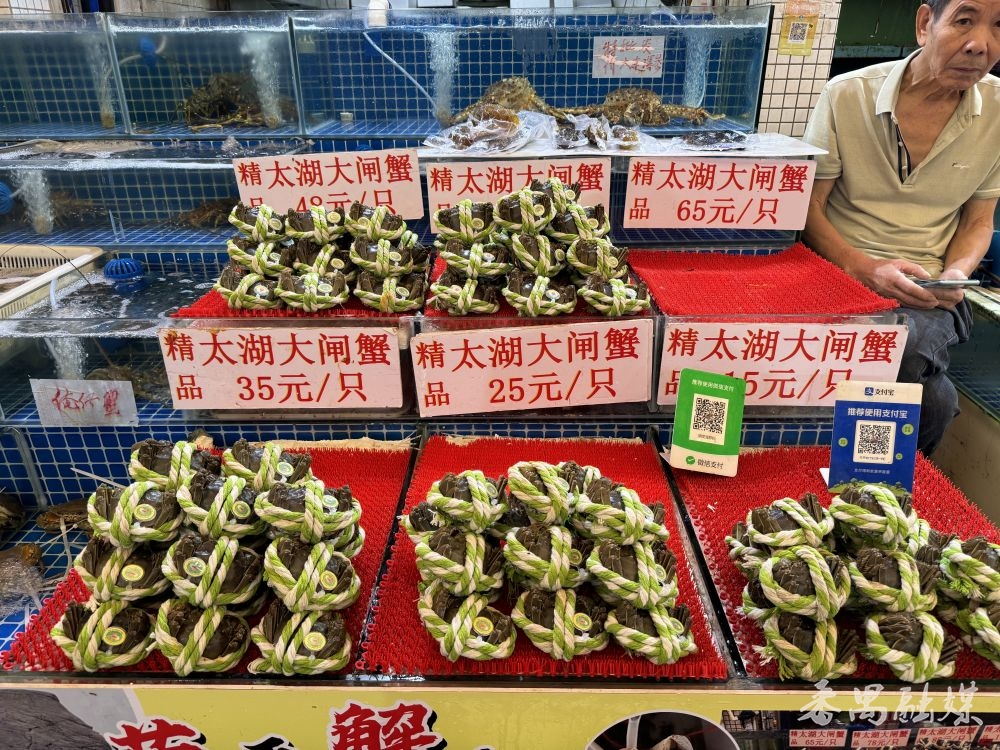 在清河综合市场的多个水产摊位上,大闸蟹成为了当季的明星产品。这些大闸蟹大小不一,价格也各不相同,大多数售价为25元一只、35元一只和45元一只,满足了不同消费者的需求。据商家介绍,这些大闸蟹大多来自江苏太湖,以太湖蟹特有的鲜美和肥硕赢得了市场的青睐。