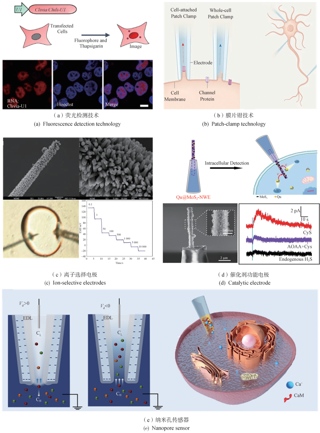 随着新药研发和细胞分析技术的发展,对细胞内物质检测的传感器提出了更高要求,荧光检测技术、膜片钳技术、纳米孔技术等都被应用于细胞内物质检测领域(图2),以期实现细胞内细胞核、蛋白等日益精准的检测需求。面对越来越高的胞内物质的分析要求,传感器未来的设计也将朝着更灵敏和更特异性、多功能化、多模态化等方面发展。