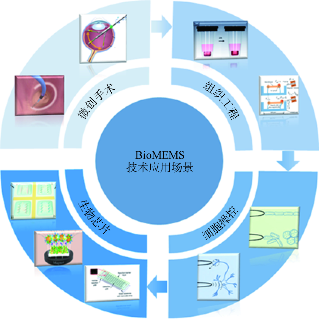 在医学治疗方面,BioMEMS具体应用包括生理化学多参数感知微结构及精密手术执行器等微器械的制备,其相关技术和产品已覆盖微创手术、组织定向送药、细胞手术治疗及病毒免疫等多方面,可完成传统医学手段所无法企及的诸多任务(图5)。BioMEMS技术的研究将为生物医疗发展开辟一个崭新的领域,为精准医学提供强大的技术支撑。