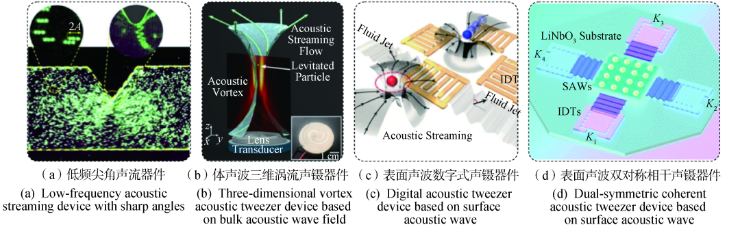 在表面波微流控器件中,最为典型的是表面波声镊器件和微流控声表面波生物传感器。美国印第安纳大学Guo团队展示的器官型细胞簇组装技术,可快速可靠地评估癌症免疫疗法,预测患者对辅助治疗的异质性治疗反应。Collins等提出的纳秒脉冲声镊,利用两个行波场间的脉冲延迟来控制驻波场范围;Pan等提出的双轴对称可重构声镊,则是利用换能器间的相位与幅值调制来控制波节点形状与分布;在国内,西安电子科技大学秦咸明等提出的声学阀器件,则是利用多组换能器的逻辑控制,实现分选与捕获功能的集成与快速切换。整体而言,在声流控技术的应用层面,国内以西安交通大学、中国科学院深圳先进技术研究院、南京大学为代表的科研院所与国际领先水平并驾齐驱,但在声学与流体耦合等基础研究方面,国内研究尚处于追赶阶段。