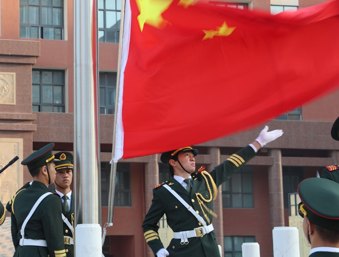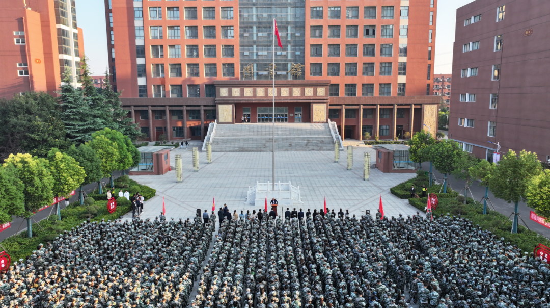 今年是新中国成立75周年。为全面贯彻党的二十大和二十届三中全会精神,深入学习宣传贯彻《中华人民共和国爱国主义教育法》,将国旗、国歌、国徽作为重要教育内容,激发学生爱党爱国爱社会主义热情,9月23日、24日,河南工业贸易职业学院分别在优胜、龙湖校区举行升旗仪式暨国旗下的思政课活动。校党委书记李国锋为2024级新生讲授思政课暨“开学第一课”,活动由党委副书记柴瑞帅主持。
