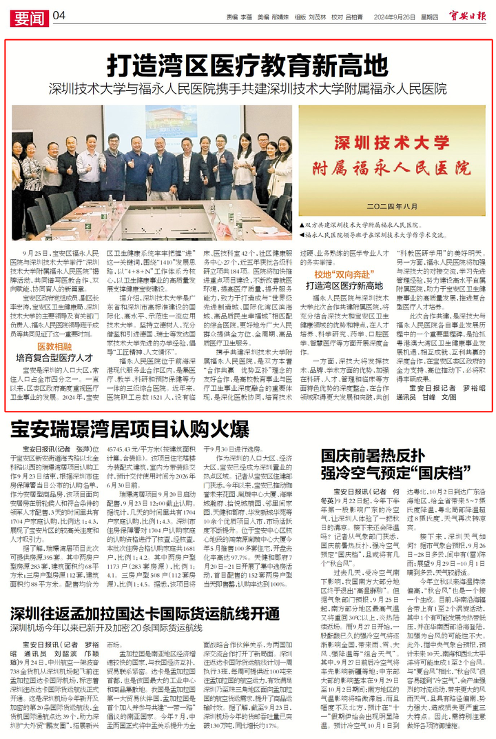 9月25日,宝安区福永人民医院与深圳技术大学举行“深圳技术大学附属福永人民医院”揭牌活动,共同谱写医教合作、双向赋能、协同育人的新篇章。