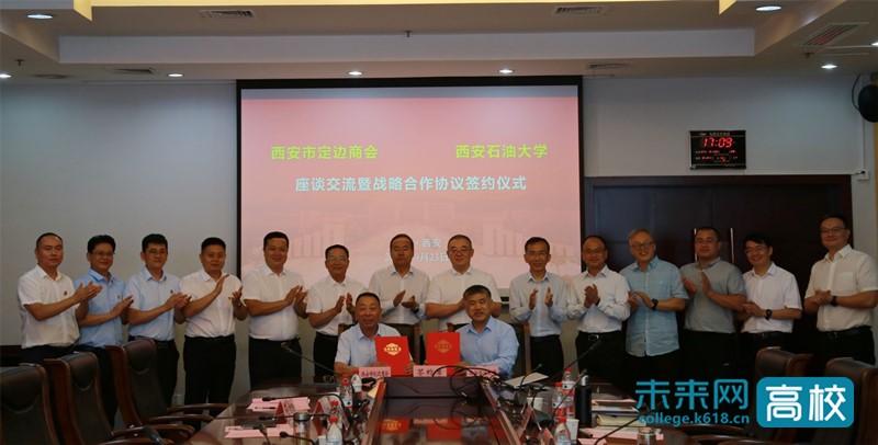 9月23日下午,西安石油大学与西安市定边商会在鄠邑校区开展座谈交流暨战略合作框架协议签约仪式。西安石油大学党委书记常江、副校长赵健,西安市定边商会会长魏云章出席会议。会议由西安石油大学党委副书记张木主持。