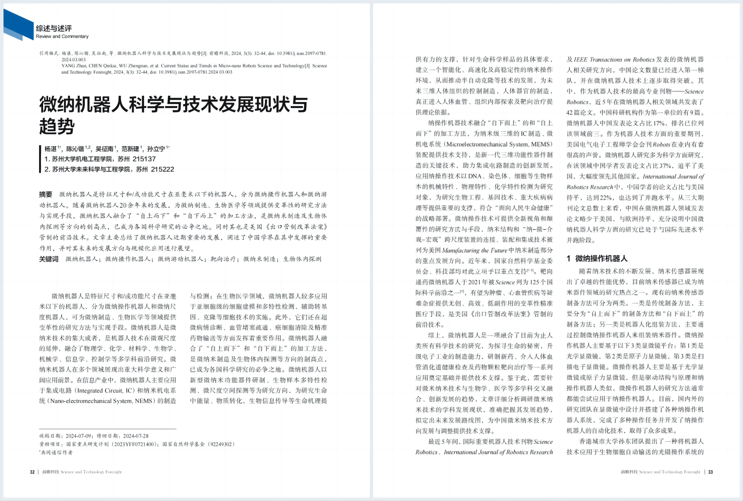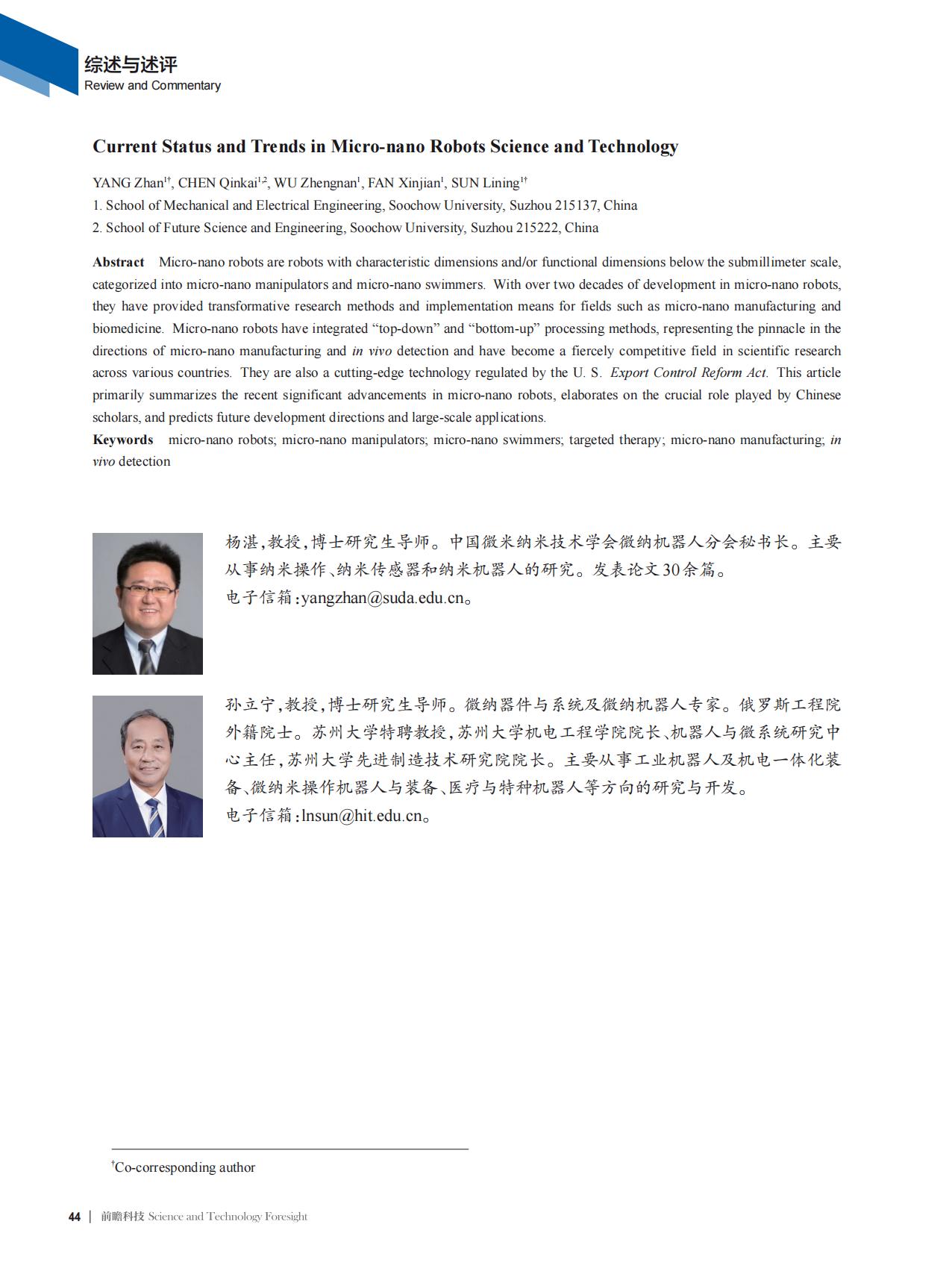 综述与述评 | 杨湛,孙立宁等:微纳机器人科学与技术发展现状与趋势