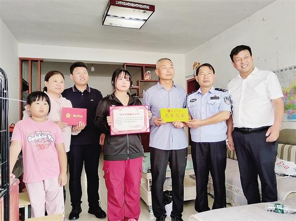 张安琪(左四)在家中接受“见义勇为”行为人荣誉证书。