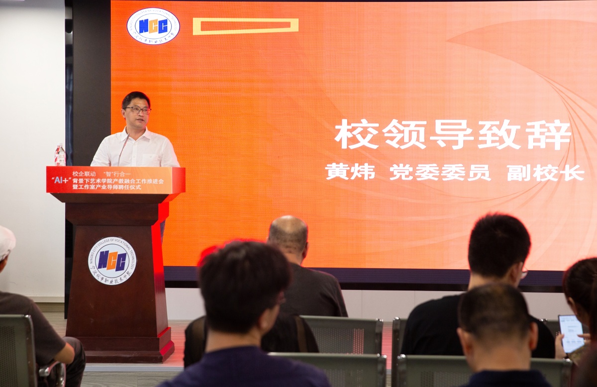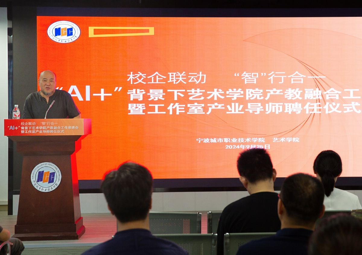 9月25日下午,宁波城市职业技术学院艺术学院召开“AI+”背景下产教融合工作推进会,旨在探讨艺术设计教育与人工智能的融合与发展。宁波城市职业技术学院党委委员、副校长黄炜,艺术学院党总支书记陆益,艺术学院副院长(主持工作)王炳根,艺术学院副院长苟劲松,以及33家合作企业的负责人及21个2025届工作室导师50余人参加了会议。