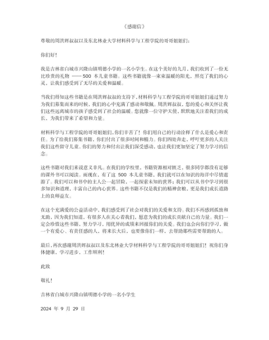 当这一箱箱书籍踏上征程,向着吉林省白城市通榆县兴隆山镇进发时,所有人的心中都充满了期待。而在明德小学,孩子们得知远方的哥哥姐姐们为他们送来了书籍,那份喜悦和感动溢于言表。他们用稚嫩的笔触写下了一封封感谢信,字里行间充满着对东北林业大学材料学院哥哥姐姐们的感激之情。“亲爱的哥哥姐姐们,谢谢你们的书籍,我们一定会好好学习,不辜负你们的期望。” 这样简单而真挚的话语,让每一个参与活动的人都感受到了爱心的力量。