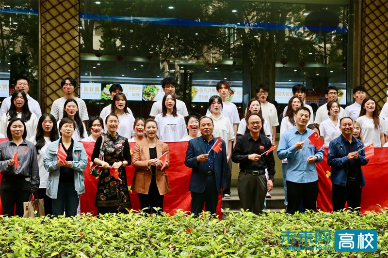 当天中午12时,参加快闪活动的学生在学校学生餐厅门前集合,活动在朱玥、冯洋洋两位老师领唱的歌曲《五星红旗》中拉开序幕。“五星红旗啊五星红旗,你将中华民族的心连在了一起。五星红旗啊五星红旗,你让全世界中国人扬眉吐气。”跟随着歌词,在场师生纷纷举起手中的五星红旗,跟着节奏的律动挥舞,表达着对祖国的无限敬仰与热爱。