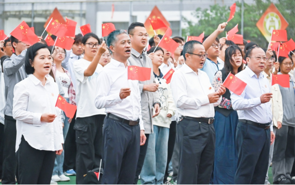 风雨兼程七十五载,弦歌永续初心不忘。升国旗仪式在全场齐声高唱《我和我的祖国》中落下帷幕。国旗迎风招展,现场红旗飘舞、全体人员心情亢奋,人群久久不能离散。