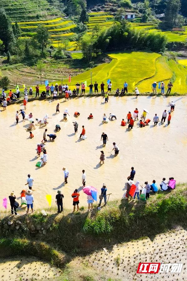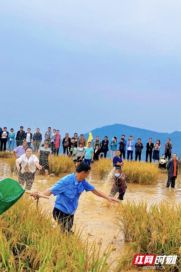 游客在溆浦山背花瑶梯田景区体验水田捉鱼。景区供图
