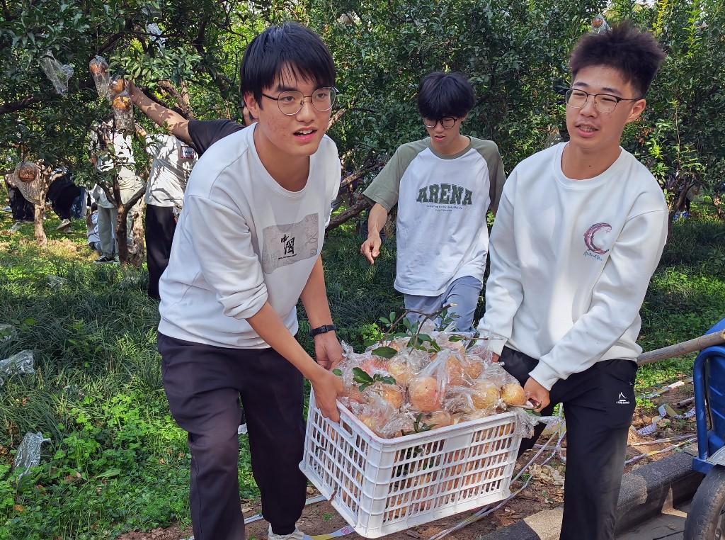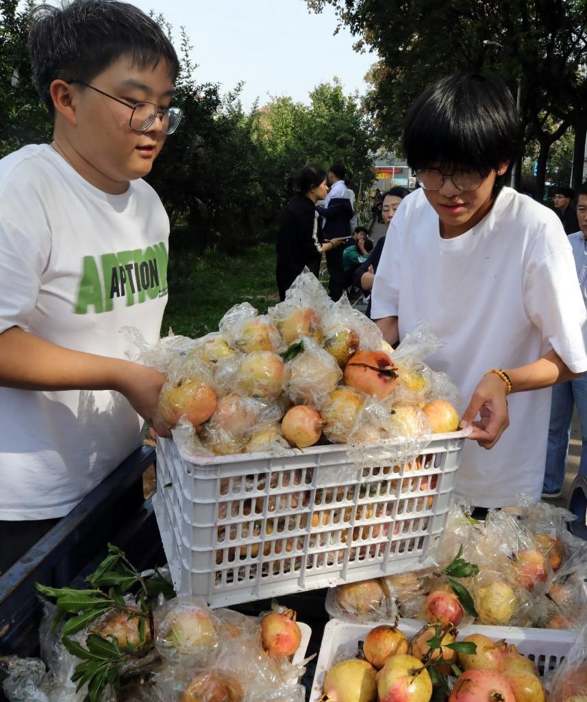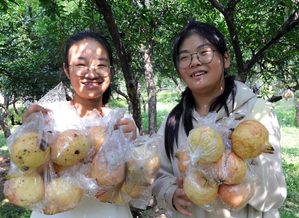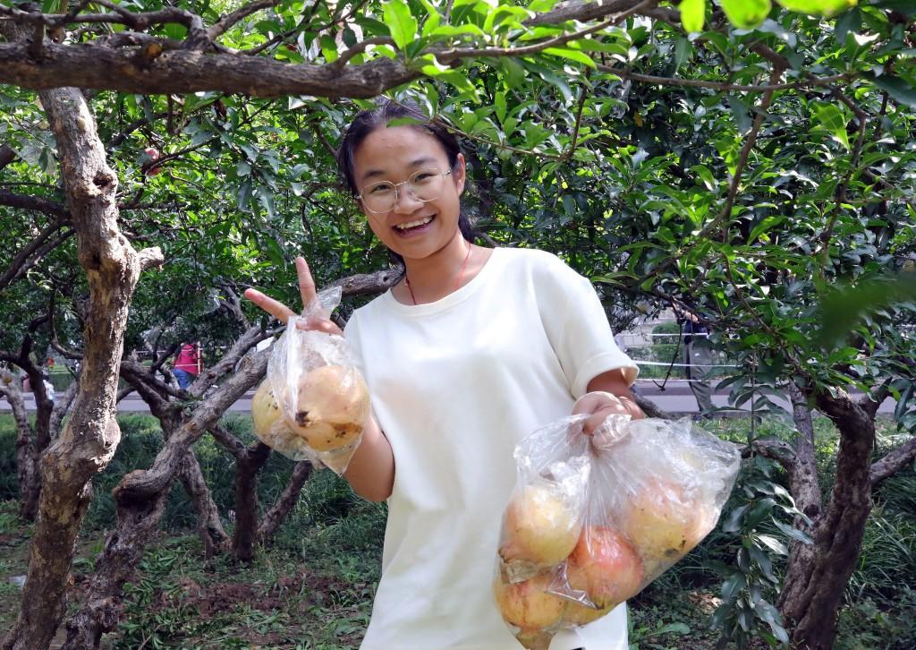 “我老家在广西,不产石榴。今天,通过石榴采摘,让我感受到了劳动的光荣,经过和队友的团结协作,看着我们的劳动成果,很开心!”计算机学院的大一新生李安桐说。