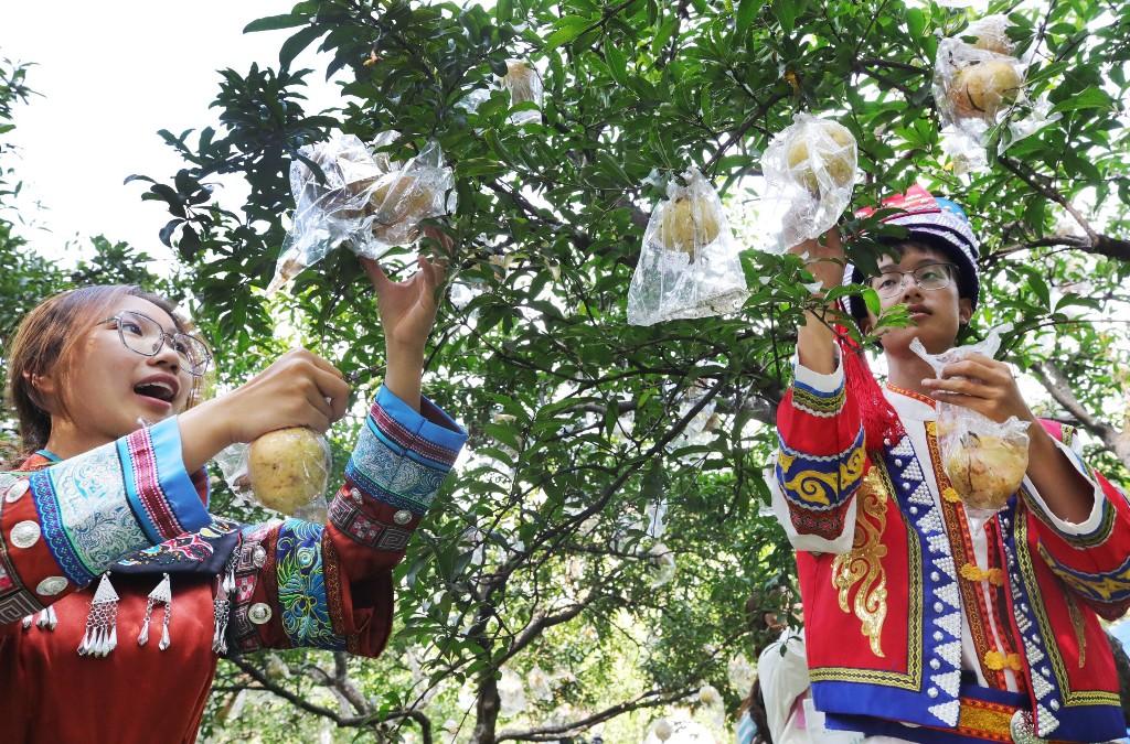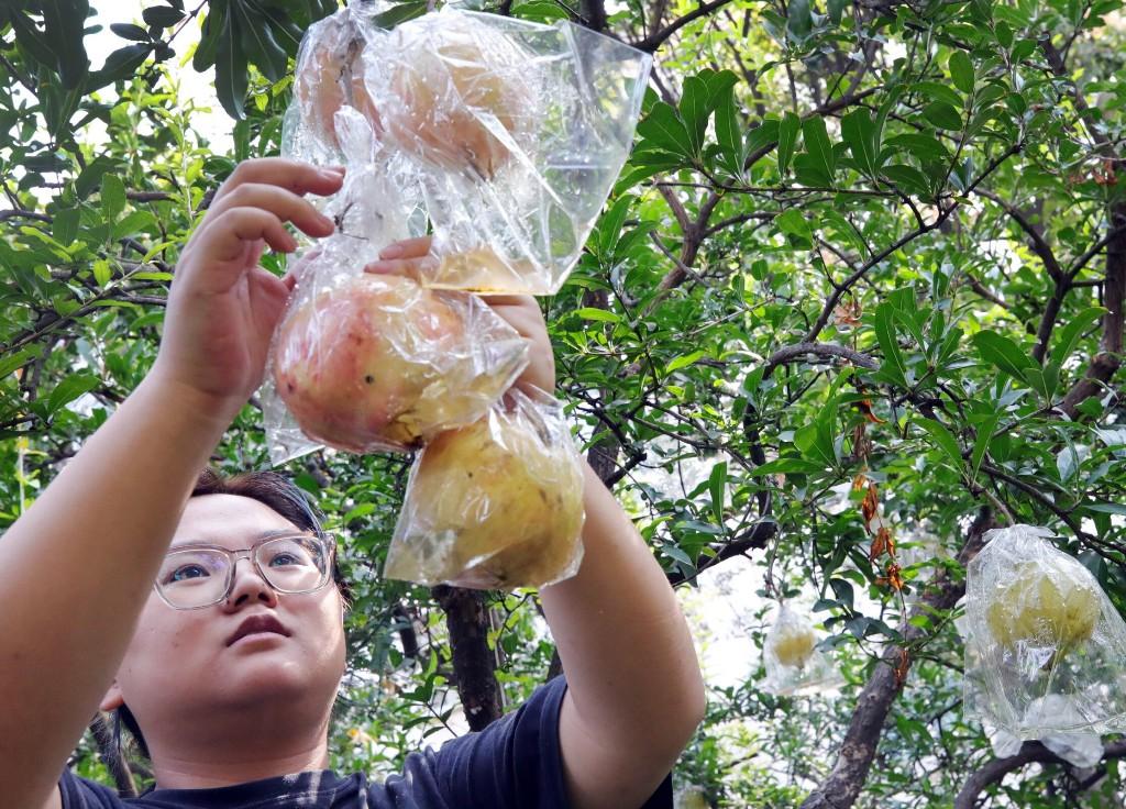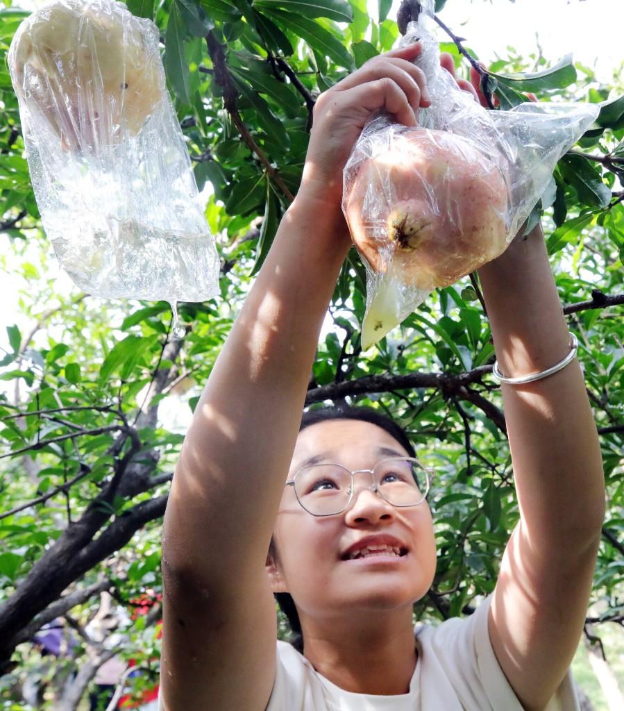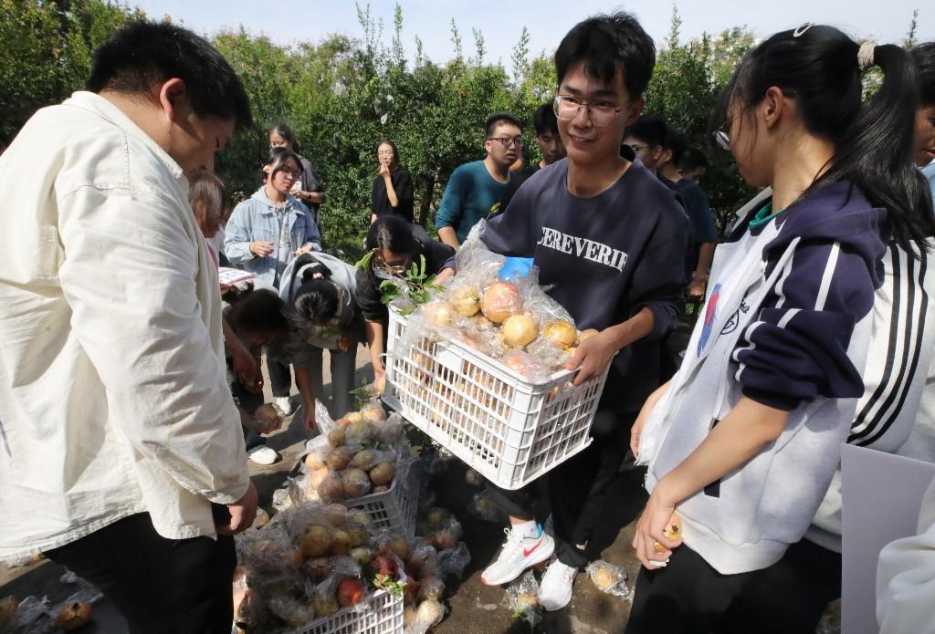 “我老家在广西,不产石榴。今天,通过石榴采摘,让我感受到了劳动的光荣,经过和队友的团结协作,看着我们的劳动成果,很开心!”计算机学院的大一新生李安桐说。