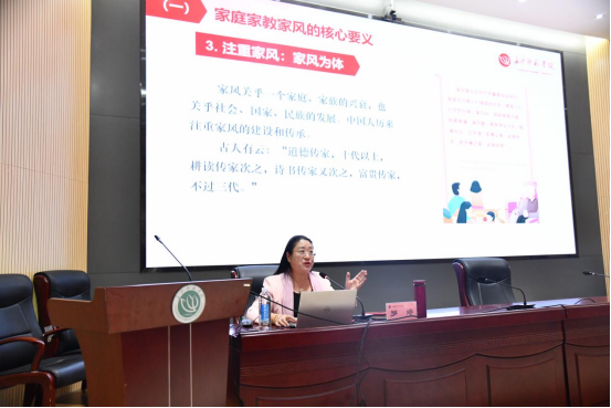 长沙师范学院党委书记兼厅关工委家庭教育中心主任、二级教授、博士生导师罗婷做了题为《加强家教家风建设,推动家校社共育高水平发展》的专题讲座。她从深刻把握关于家庭家教家风建设的精髓要义、坚守“五个回归”的家校社共育理念、创新“三学”一体化发展的育人模式三个方面展开。她指出,家校社共育要坚守教育回归育人初心、学校回归教育主阵地、家长回归家庭教育本位、政府回归教育治理、社会回归教育公益的理念,并结合长沙师范学院的发展历程与特色,介绍了“(幼学-家学-女学)三学”一体化发展的育人模式。