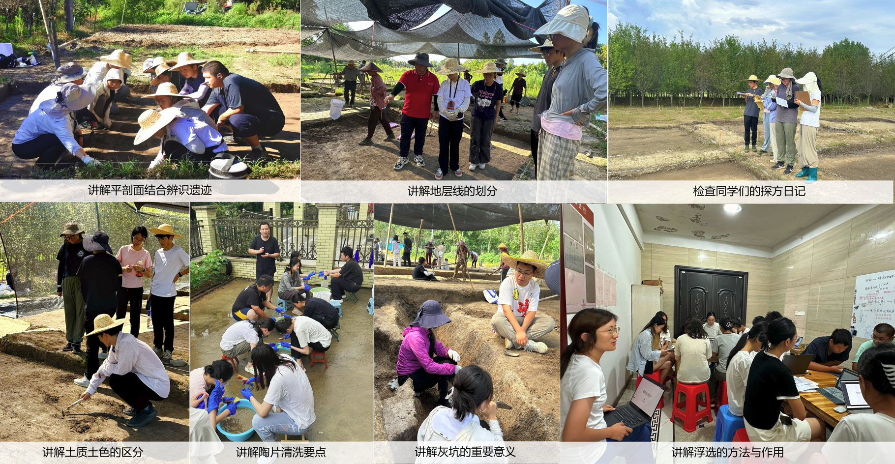 此次遗址发掘区内共布设10个探方,由两位同学负责1个探方的发掘,指导教师们在探方里,教同学们如何观察土质土色的微妙变化,如何判断遗迹的平面范围和层位关系。尽管酷暑难耐,但大家在日复一日的实践中,努力提升实践技能,逐渐摆脱了初出茅庐的青涩,也切身体会到考古工作所必备的实事求是的科学精神、不畏艰难的耐力决心、互帮互助的团队合作。