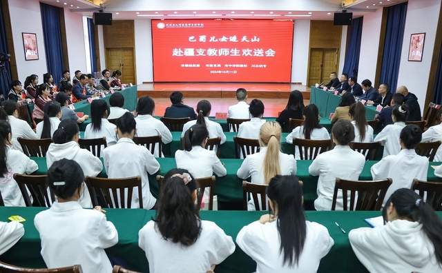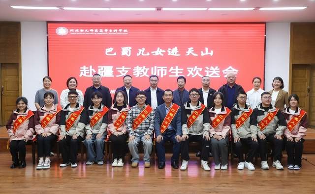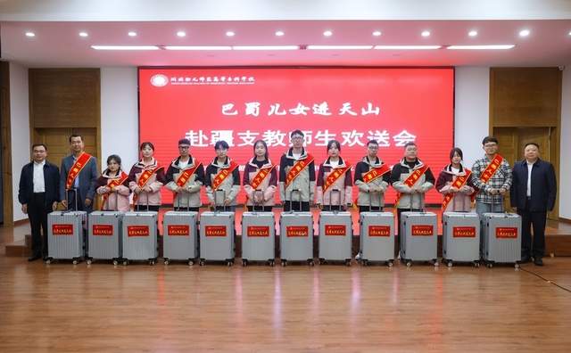 张斌在欢送会致辞时向市委统战部、市委教育工委、市中华职教社一直以来对川北幼专的关心支持表示衷心的感谢!向赴疆支教师生代表表示由衷的赞许!他指出,援疆支教是落实新时代党的治疆方略的生动实践,是促进民族交往交流交融、铸牢中华民族共同体意识的重要举措。学校自2016年启动“巴蜀儿女进天山”教育援疆工程以来,共向南疆地区输送680余名优秀学生,援疆学生躬耕边疆讲台,赓续中华文脉,努力提高国家通用语言文字普及率、致力提升儿童汉语听说读写能力,一大批学生已逐渐成长为服务当地教育事业发展的新生力量,成为扎根边疆建设的美丽“胡杨”。
