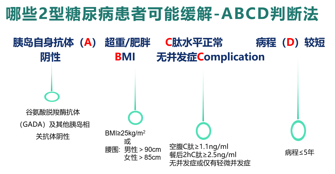 曾天舒教授进一步解释说,“ABCD”判断法需注意适用条件,要排除三类情况,一是排除特殊类型糖尿病,包括皮质醇增多症、生长激素瘤、胰高血糖素瘤以及一些遗传因素导致的糖尿病;二是排除自身免疫型糖尿病,这类患者中没有糖尿病可以缓解的临床证据;三是排除病程较长、并发症较重、胰岛功能较差(血糖达标时,空腹C肽<1.0μg/L)的T2DM患者。