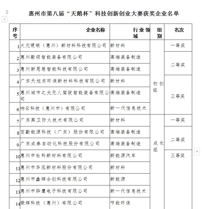 会上还宣布了惠州市第八届“天鹅杯”科技创新创业大赛获奖企业名单,大元硬碳(惠州)新材料科技有限公司获得初创组一等奖,广东黑卫防火技术有限公司获得成长组一等奖。