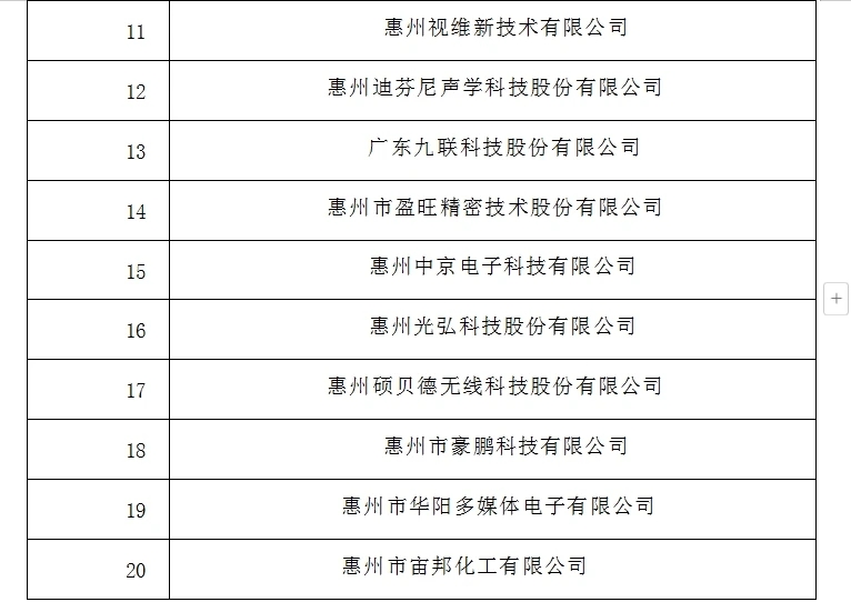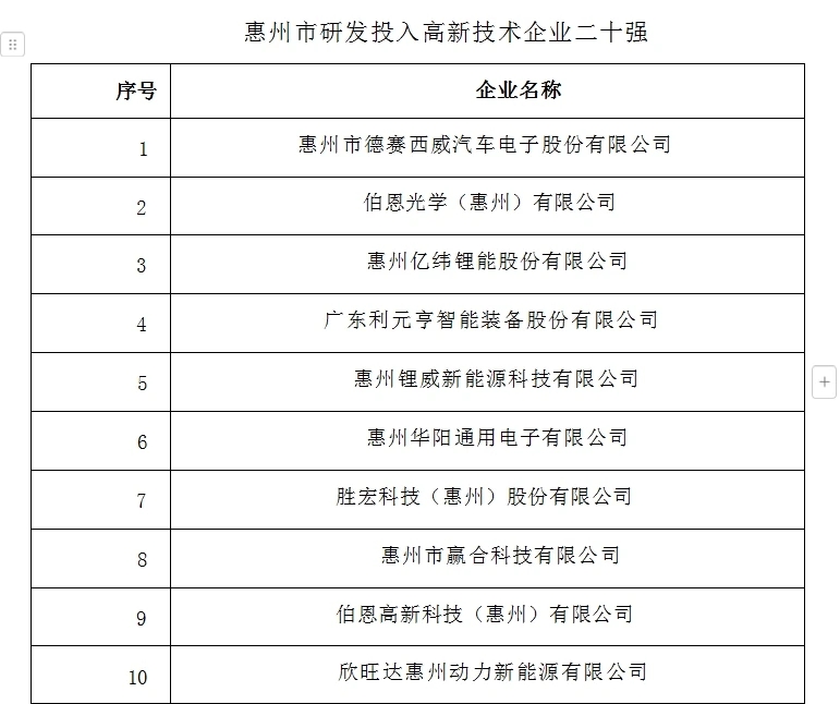 会上,发布了惠州市重点高新技术企业名单,包括综合实力高企二十强和研发投入高企二十强。市科技局相关负责人介绍,综合实力高企二十强是指经济规模、科技含量或者社会影响力等方面在我市具有领先地位,营业收入、营业利润、研发投入总额、硕士及以上研发人员数、市级以上创新平台、新增发明专利申请数、拥有有效发明专利数、技术合同成交金额等多项指标综合排名前20位的高新技术企业。研发投入高企二十强是指研发能力在我市具有领先水平、通过持续的研发投入促进核心技术自主可控,税前加计扣除的研发投入占营业收入的比重不低于3%且在我市排名前20位的高新技术企业。