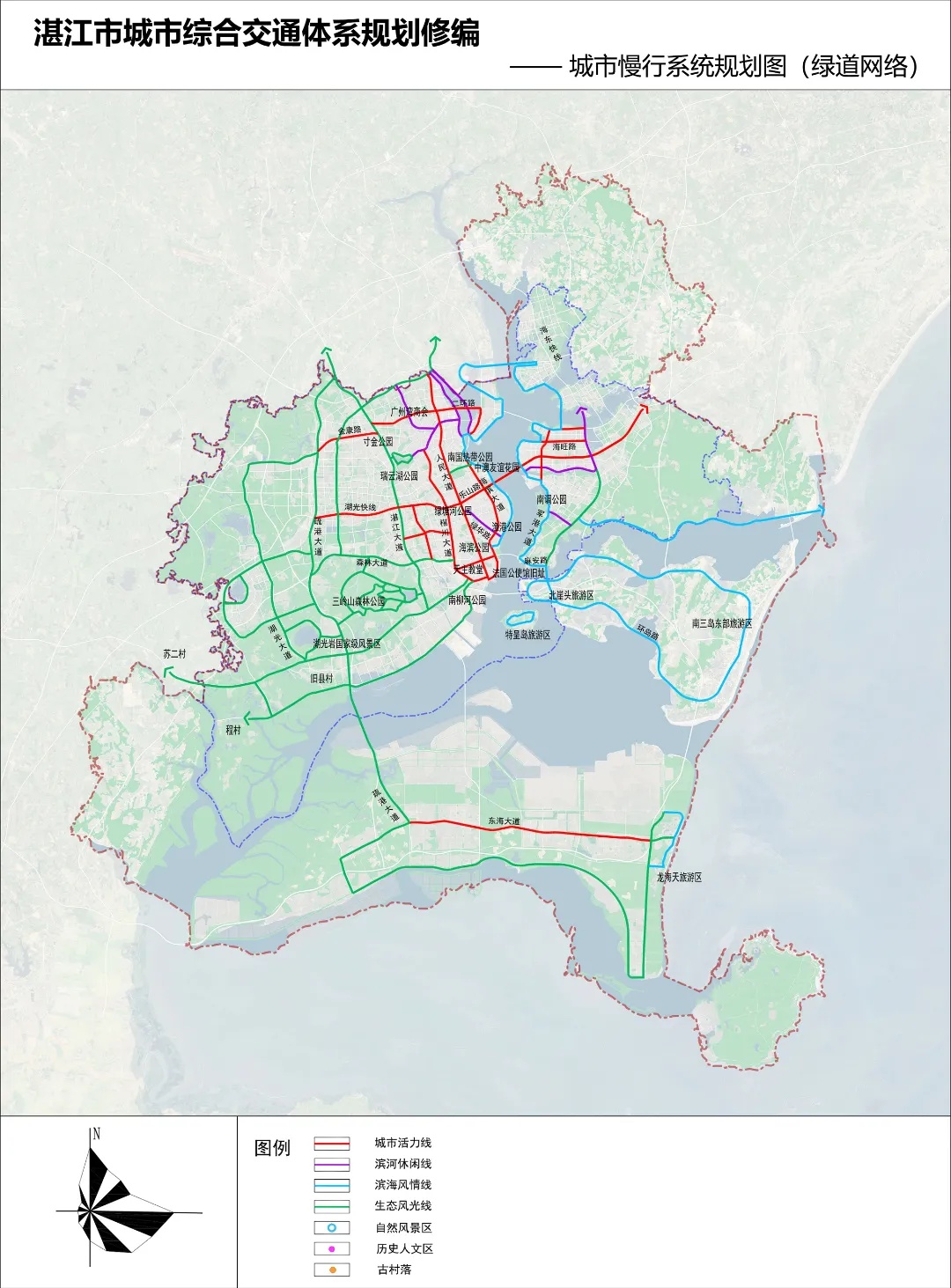 依托城市道路,打造“两类三级”通勤慢行系统,依托山水海滨资源和历史文化资源打造具有湛江特色的休闲慢行系统。