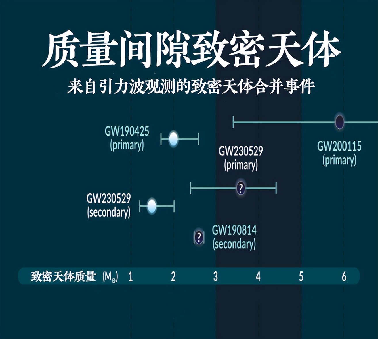 近60年来,传统X射线方法已经证认并测量了20余颗恒星级黑洞的质量,其质量分布显示为,缺少3-5倍太阳质量的小黑洞。这一区间被称为质量间隙(图1)。这与黑洞形成理论的预期——小质量黑洞数量远多于大质量黑洞——差别巨大。