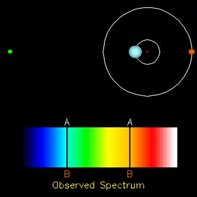 图3 :左图:恒星朝向或远离我们时,恒星光谱的向短波长方向移动(蓝移)或向长波方向移动(红移),可转换为恒星在视线方向上的速度变化(一维运动)。右图:双星运动导致亮星(可见星)在天球上的投影(二维运动)。(图片来源:ESA)