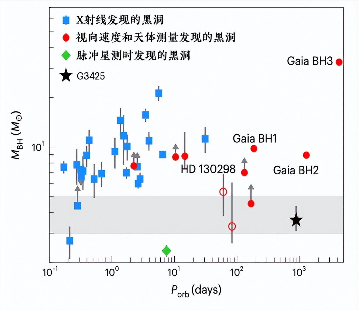 图5:G3425与其它恒星级黑洞在质量—轨道周期分布的比较。G3425的小黑洞位于图中的右下方。(图片来源:根据参考文献1改编)