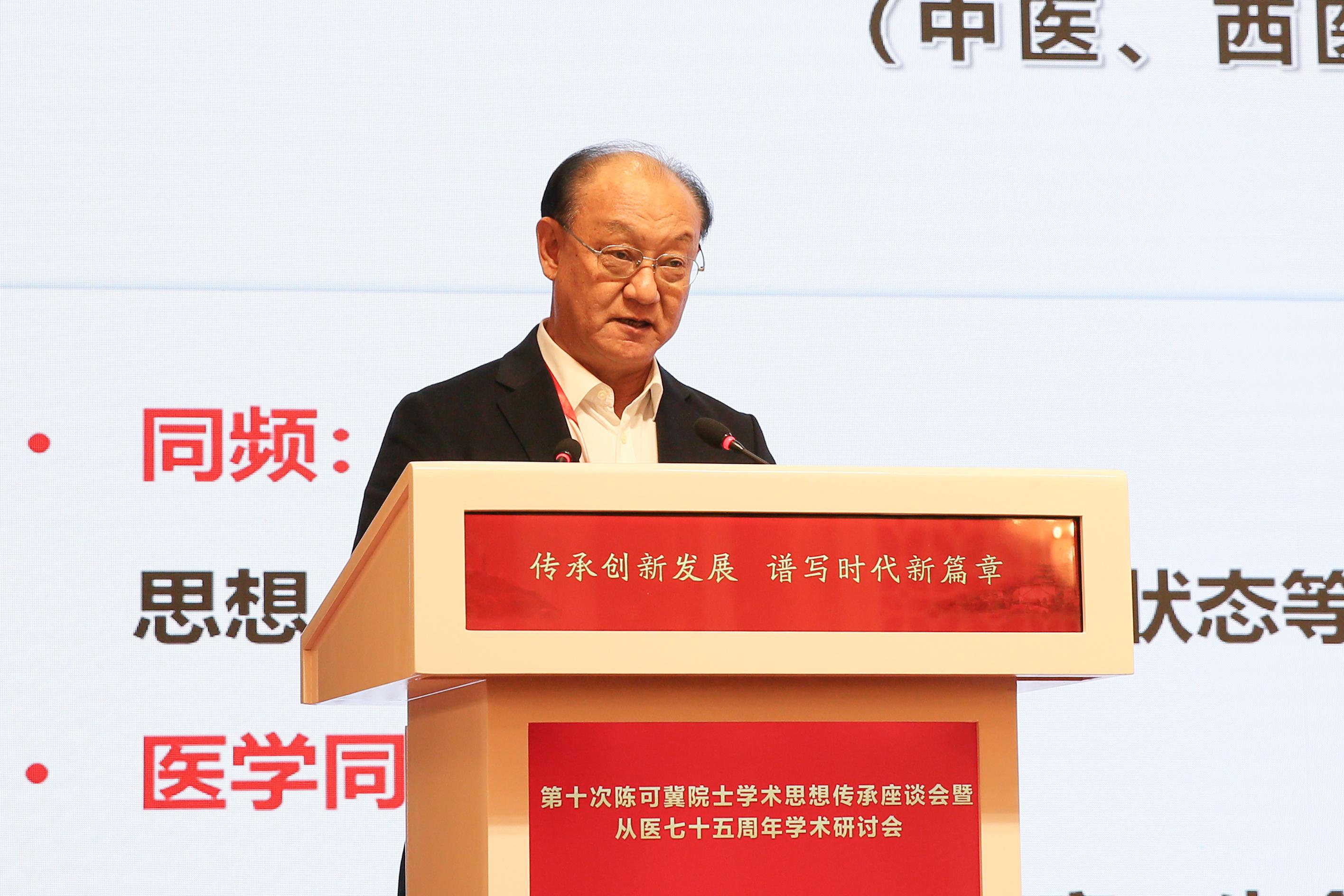 主题报告环节,陈可冀院士以“开放包容,促进中西医结合发展”为题作主旨发言。陈可冀院士畅谈西医学习中医与从事中医、中西医结合心血管病等方面的临床及研究经历。他强调,要重视文化医德的传承、学术理论及临床经验的传承,努力做到人文价值观与社会价值观相结合,民族性与时代性相结合、中医药学临床治疗八法与现代医药学新进展相结合。他勉励广大中医药工作者提高民族自信心和时代精神,自觉做到中西医精诚团结合作、优势互补,在继承基础上创新发展,服务健康中国,不负伟大时代。