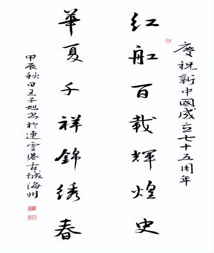 也有同学以书法的形式,书写了对祖国的美好祝愿,表达对祖国母亲的热爱。( 李秋实、李婷玉、陈默涵、凌启博 )